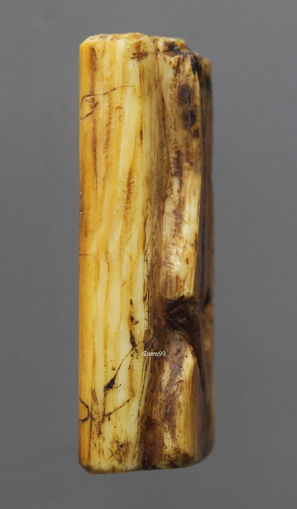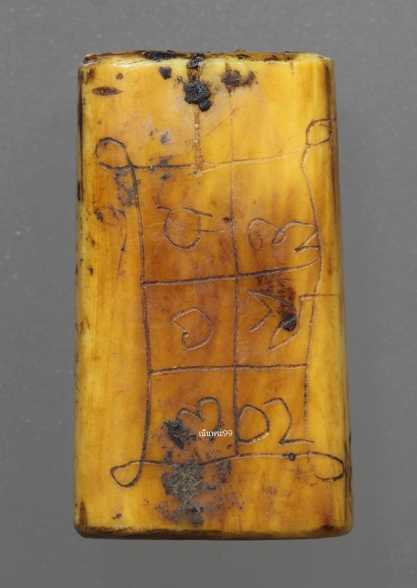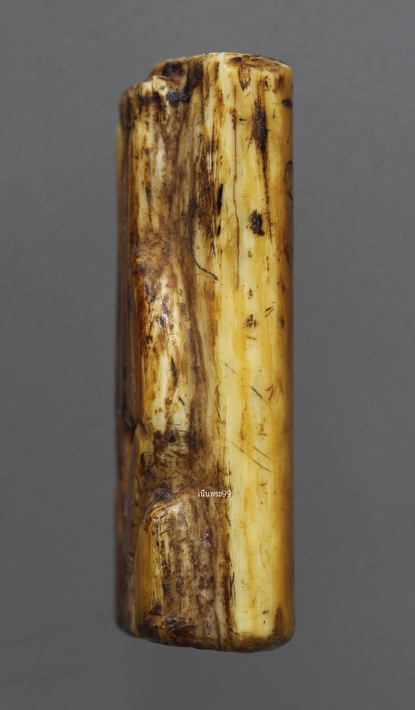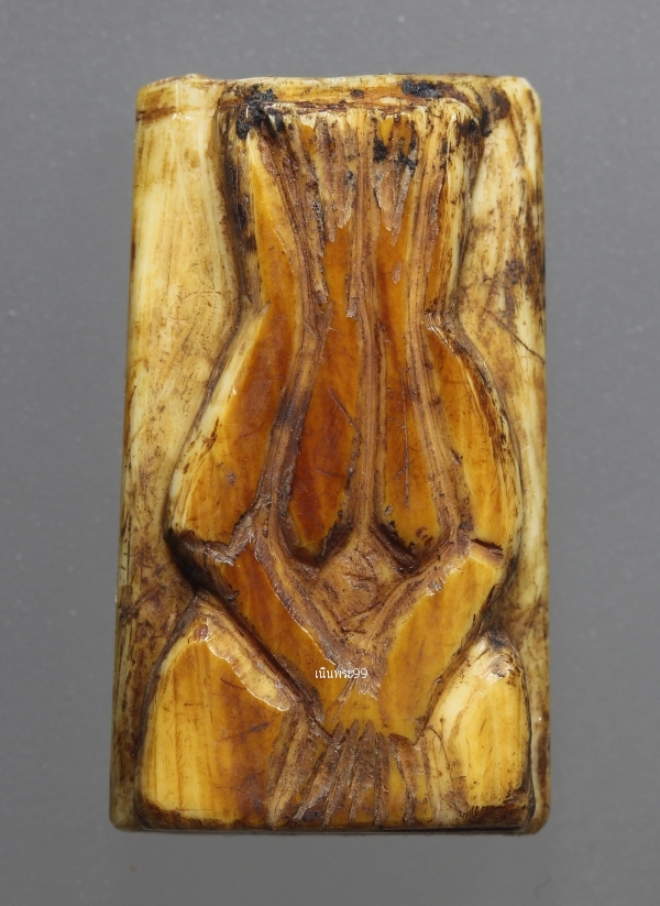 ปิดตางาแกะ หลวงปู่รอด วัดบางน้ำวนยุคต้น เก่าเดิมจารขอม ด้านหลังคลาสสิค พระปิดตางาแกะหลวงปู่รอด ยุคต้นพิมพ์ชะลูดสูง 2.6 ซ.ม. กว้าง 1.6 ซ.ม.จารขอมมอญครบสูตร ปีพ.ศ.2470 เนื้องาช้าง แกะขึ้นรูป สภาพสวยแชมป์ผิวหิ้ง สุดยอดของความหายาก เนื้องาแห้งสนิทเก่าจัดจ้านเข้มขลังจนเนื้องา ฉ่ำในตัวแล้วดูง่ายสุด วัดบางน้ำวน องค์ที่นำมาเสนอองค์นี้ พระปิดตาแกะหลวงปู่รอดยุคต้น เท่าที่พบจะมีอยู่ด้วยกัน 3 เนื้องาแกะ เนื้อไม้ขนุนแกะ เนื้อหวายลูกนิมิตาแกะ ส่วนขนาดและรูปทรงขององค์พระจะมีด้วยกันหลายพิมพ์-หลายขนาด ไม่ตายตัวเพราะว่างานแกะขึ้นรูปในสมัยนั้นเป็นงานแกะมือ แต่เอกลักษณ์เฉพาะตัวที่สามารถใช้เป็นตัวบ่งชีว่าเป็นพระปิดตางาแกะของหลวงปู่รอดคือพิมพ์ทรงขององค์พระพุทธ .ศิลปะงานแกะจะอ้อนช้อยแต่แขวนไปด้วยความน่าเกรงขาม จะมีการลงเหล็กจารขอมมอญ เก่าทุกองค์ ส่วนค่าความนิยมและราคาเล่นหากันนั้น ถ้าสภาพความสวยสมบูรณ์ขององค์พระมีสภาพใกล้เคียงกัน พระปิดตาหลวงปู่รอดเนื้องาแกะจะได้รับความนิยมมาเป็นอันดับ 1 พระปิดตาหลวงปูรอดเนื้อไม้ขนุนแกะ จะได้รับความนิยมมาเป็นอันดับ 2 สำหรับองค์นี้ด้านบนจะมีอุดด้วยตะกรุดหนึ่งดอก รอยจารด้านหน้าด้านหลังและด้านข้างองค์พระ |